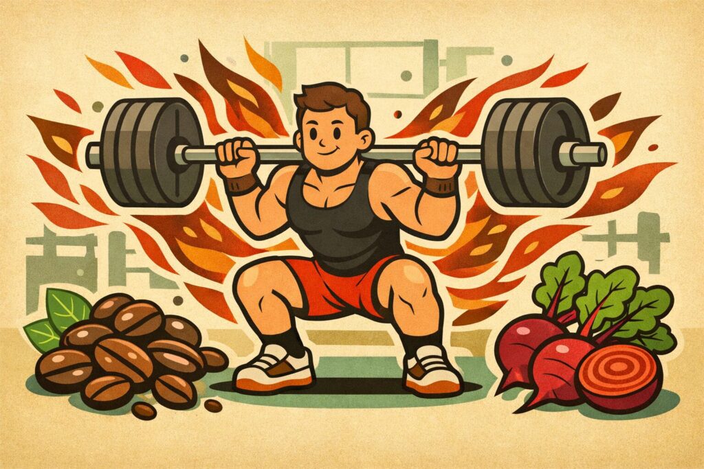 筋トレ効果を上げるカフェインとビートジュースの併用効果を解説。スクワットの持久力とパワーを最大化する科学的メソッドです。