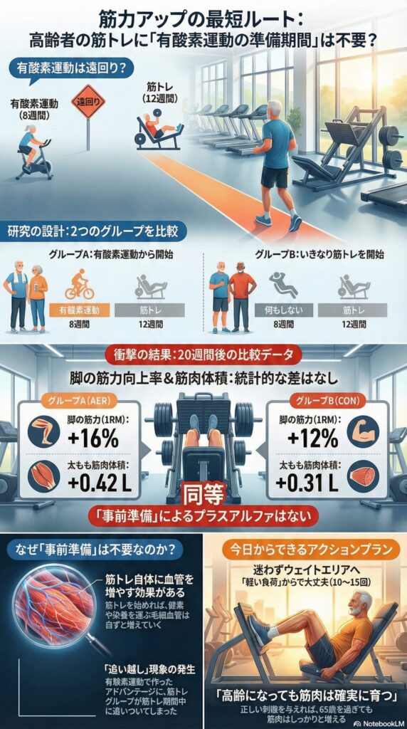 結論として、健康な高齢者が筋トレの前に有酸素運動を行って毛細血管を増やしても、その後の筋トレによる筋肥大や筋力アップ効果をさらに高めることはできませんでした。