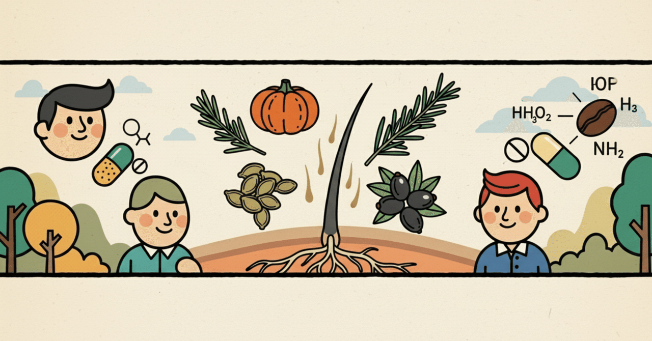 🟡結果:かぼちゃの種オイル(経口摂取で男性の毛髪数が24週間で40%増加 vs プラセボ10%)、ローズマリーオイル(トッピング塗布でミノキシジル2%と同等の毛髪数増加)、カフェイン抽出物(0.2%溶液でミノキシジル5%に匹敵する改善率10.59%)といった天然成分が、AGA治療に有効である可能性が複数の臨床試験で示された。
