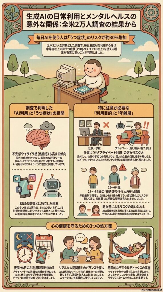 結論「毎日生成AIを利用する人は、そうでない人に比べて抑うつ症状や不安を感じるリスクが高まる可能性があることが、米国の大規模調査で明らかになりました。」