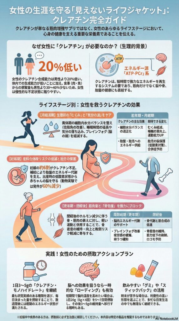 クレアチンはその不足を補い、細胞レベルでエネルギーを与えてくれる、まさに女性の生涯の「お守り」のような存在だと言えるでしょう。