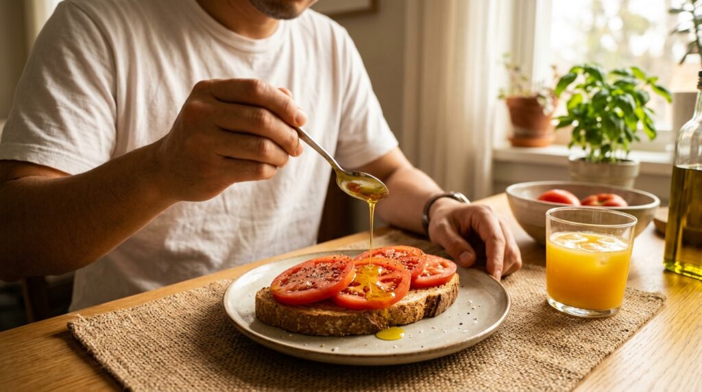 地中海式朝食で取り入れられていたように、スライスしたトマトにオリーブオイルをかけて食べるのは非常に理にかなっています。