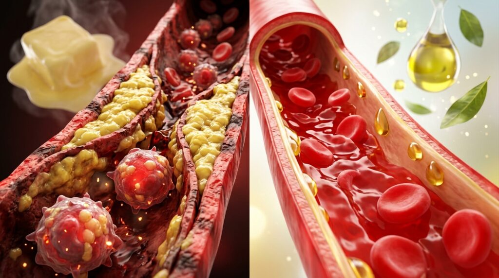 🟡 結果:バターを使った朝食(西洋式)は、オリーブオイルを使った朝食(地中海式)と比べて、食後4時間での免疫細胞への脂肪蓄積を顕著に増加させ、炎症マーカー(セルロプラスミンなど)を高くしました。