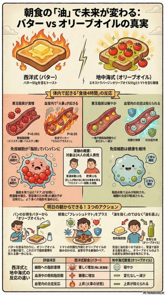 結論「朝食の脂質をバター(西洋式)からオリーブオイル(地中海式)に変えるだけで、食後の炎症反応や細胞への脂肪蓄積を抑えられることがわかりました。」