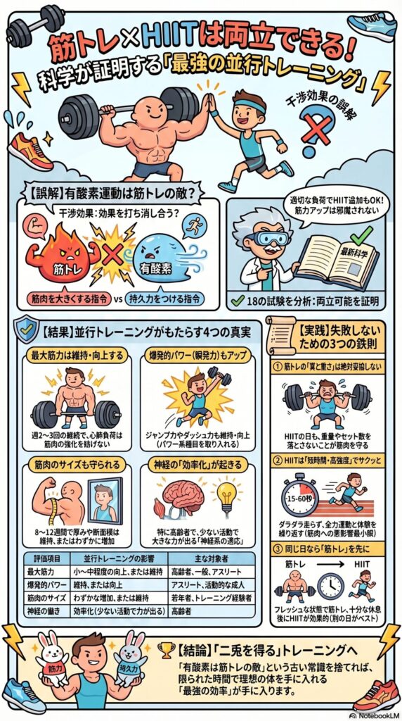 今回のシステマティックレビューが示した最も重要な結論は、「筋トレとHIITは、正しく組み合わせれば両立できる」ということです。