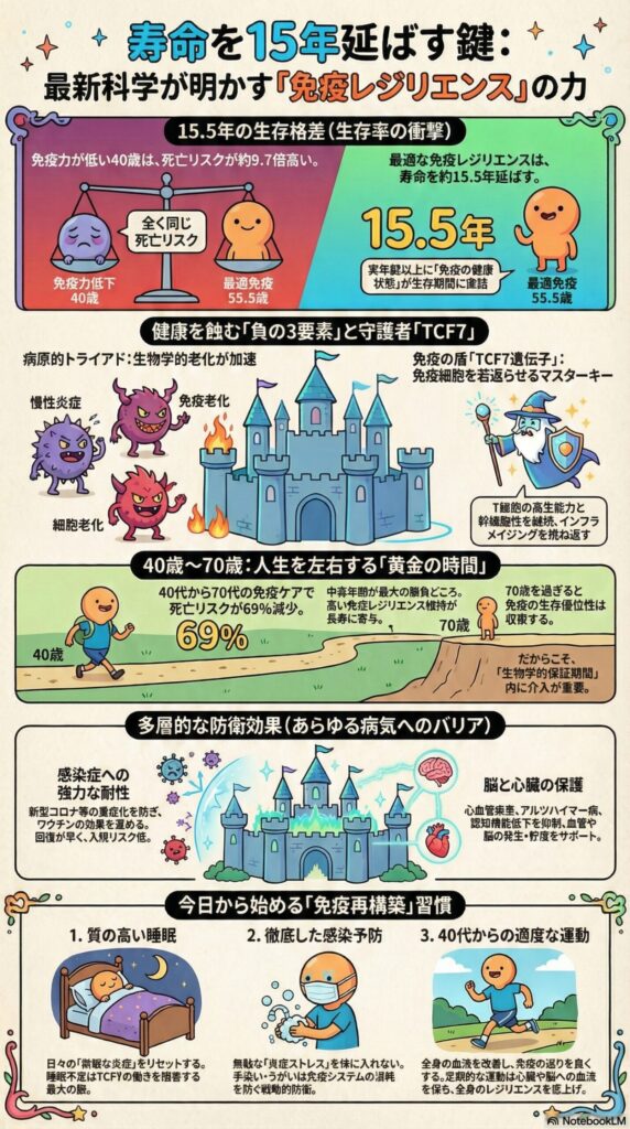 結論「免疫レジリエンス(免疫の回復力・抵抗力)を高く保つことで、寿命が最大15年以上延びることが大規模研究で判明。40代から70代の健康管理が健康長寿の最重要ポイントです。」