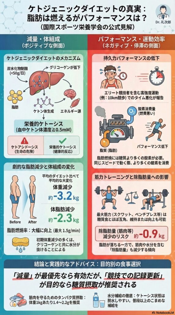 ケトジェニックダイエットは運動中の脂肪燃焼を大幅に高め、体重や体脂肪を減少させる一方で、持久力パフォーマンスには悪影響または変化なしという結果が多く、筋肉量も減少しやすいことがわかりました。