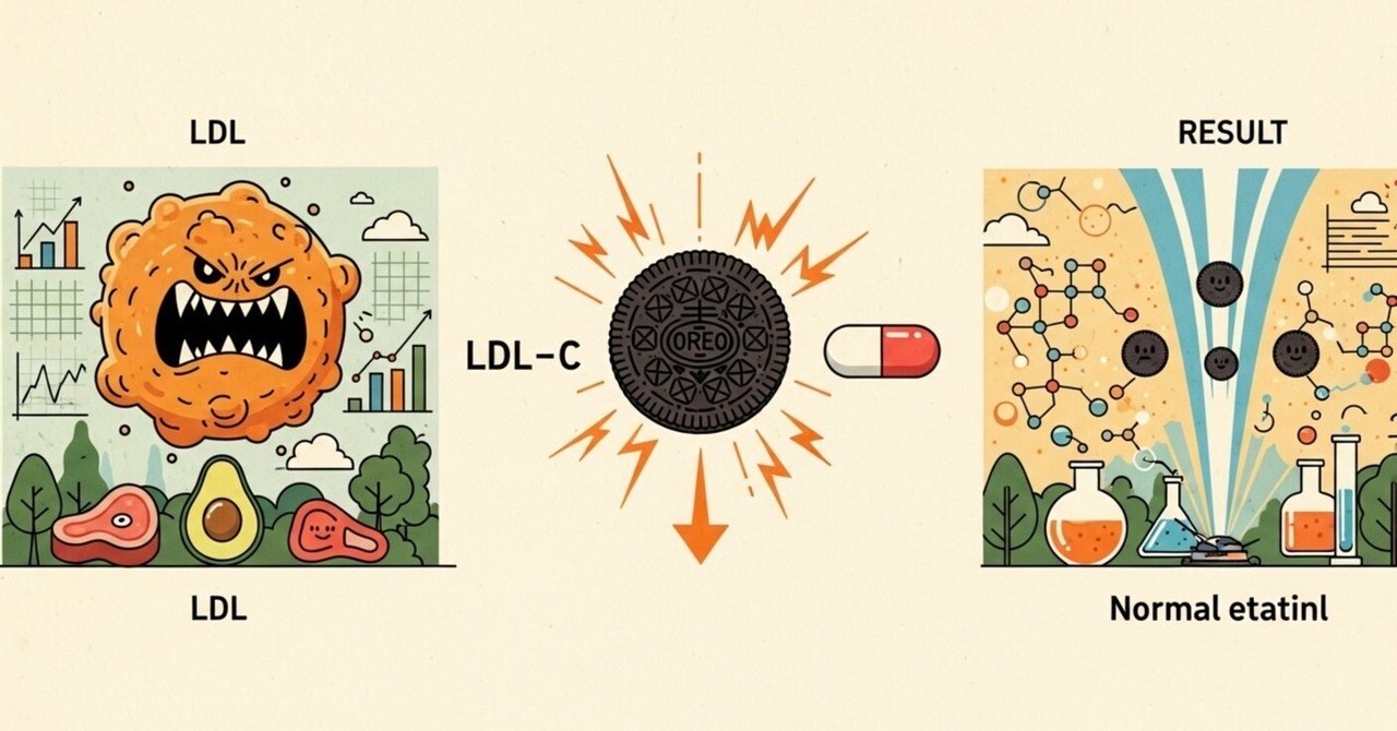 このケーススタディでは、短期間のオレオ・クッキー摂取が高強度スタチン療法よりもLMHRのLDLコレステロールを大きく低下させました。