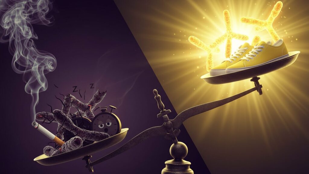 細胞の老化指標であるテロメア長とライフスタイル要因(喫煙、不眠症、運動)の関連性を対比的に表現したイラスト。喫煙と不眠症がテロメアを短縮させ、身体活動が老化を予防する様子を示す。