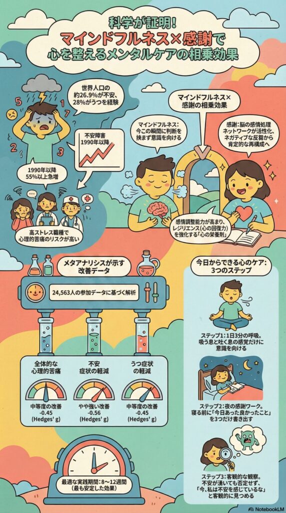 🟡 結果:2万人以上のデータ分析で、マインドフルネスは不安やうつを確実に改善し(不安への効果量が-0.56など)、8〜12週間の継続で最も効果が出ることが判明しました!