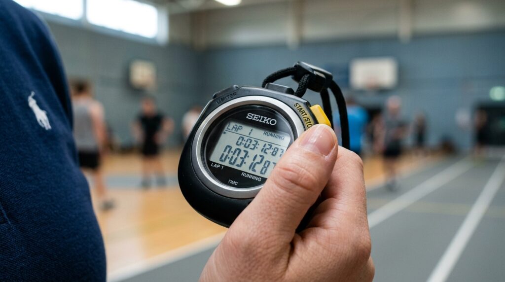 その後、実際の筋力を評価するために、専用の機器を使って「握力(キログラム)」を測定し、さらにストップウォッチを用いて「椅子から5回立ち座りする時間(秒)」を計測しました。