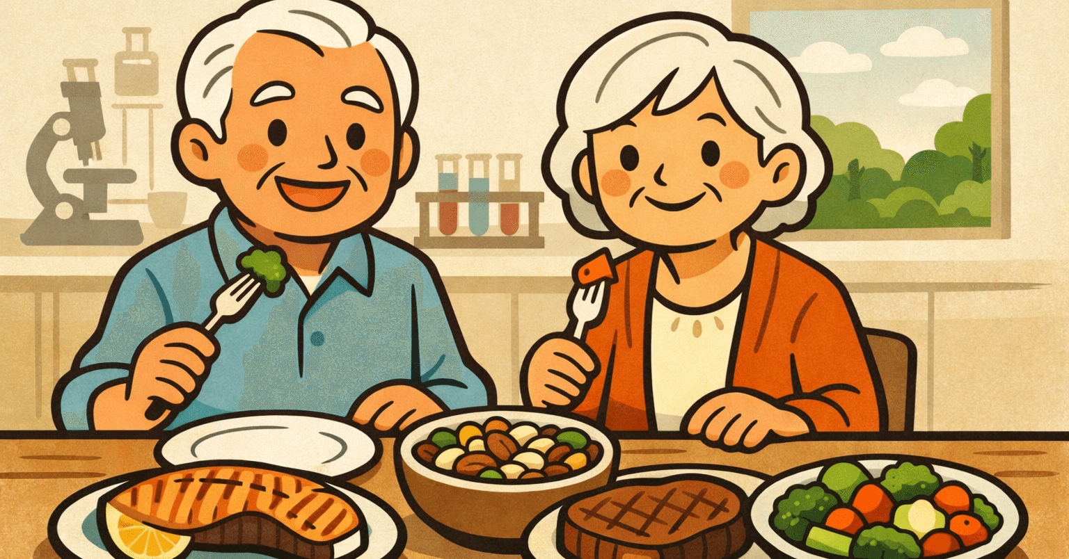 🟢教訓:お肉や魚(タンパク質・オメガ3)だけでなく、ミネラルやビタミンを含む多彩な食品を摂ることが、将来の歩行困難や転倒を防ぐ「貯筋」につながります。