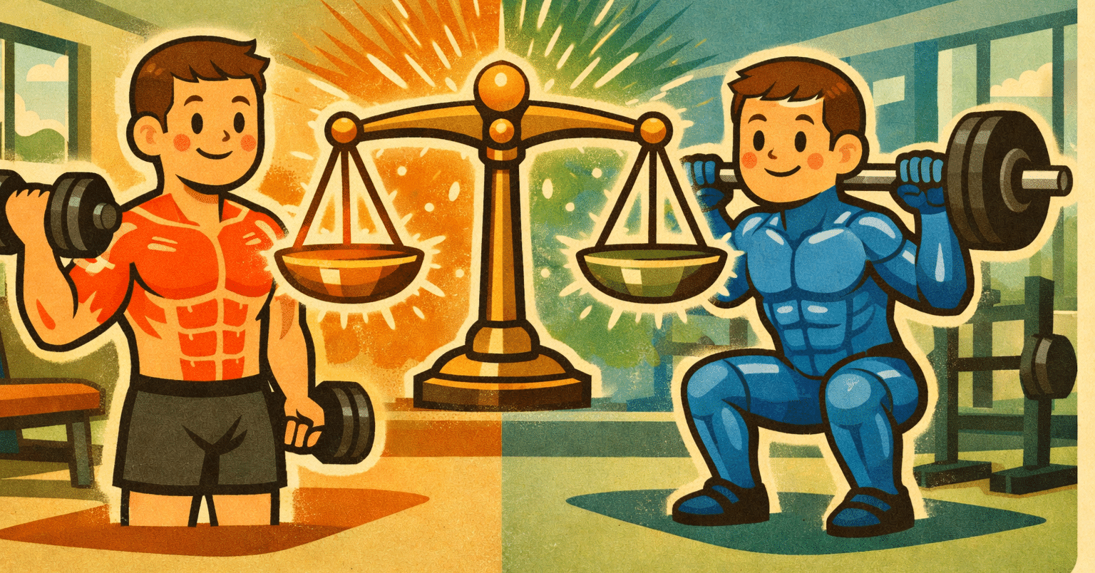 分割法トレーニングと全身法トレーニングを比較した図解イラスト。左は上半身のみを鍛える分割法、右は全身を同時に鍛える全身法を象徴し、中央の天秤が効果の同等性を示している。