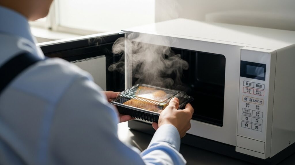 電子レンジで加熱する際はガラス容器や陶器に移し替えるなど、口に入る直前の工程だけ工夫してみましょう。