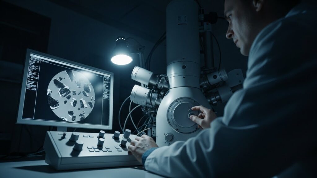 電子顕微鏡で拡大すると、そこにはギザギザした鋭利な形状の異物が写っていました。