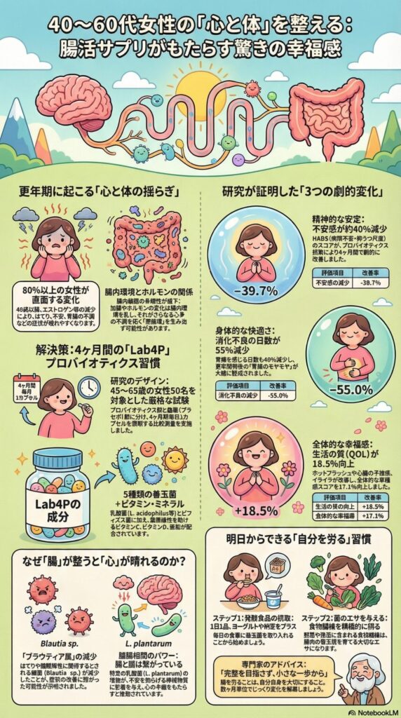 🟢 教訓:毎日の生活に乳酸菌やビフィズス菌を取り入れる腸活は、更年期前後のデリケートな時期を乗り切る強力なサポートになり得ます。