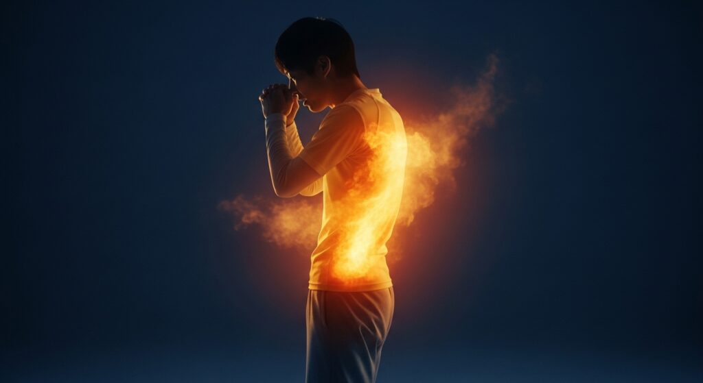 高い基礎代謝とエネルギー消費を象徴する、体内に熱エネルギーが満ちた痩せ型男性のイメージイラスト