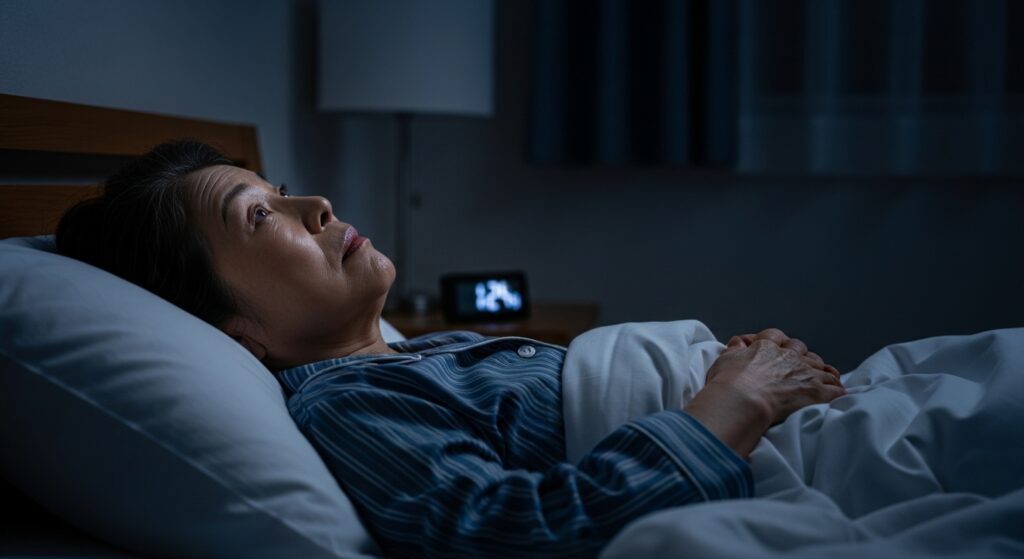 睡眠時間が短くなり、中途覚醒(夜中に起きる)が増え、睡眠効率が下がります。