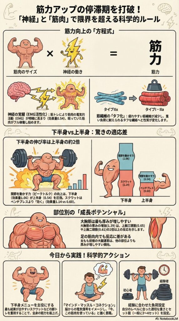 筋力アップは、筋肉自体の成長と神経ネットワークの発達という、二つの強力な変化によってもたらされます。