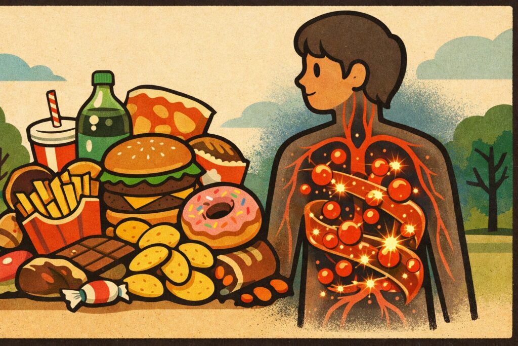 【🥦栄養・食品】 【若者も危険】超加工食品を10%増やすだけで糖尿病リスクが2.5倍に?最新研究が警告する「血糖値」の真実 若いうちの超加工食品増加が体重変化に関わらず前糖尿病リスクを1.5倍にする研究を解説。コンビニ食やジュースが血糖値に与える深刻な影響とは? 2026.01.25 【🥦栄養・食品】〘🍪加工食品・スナック〙