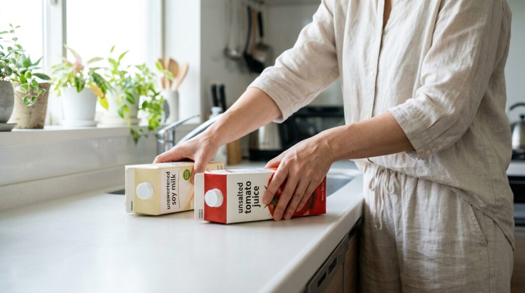 一番簡単な実践方法は、「市販の無塩トマトジュース」と「無調整豆乳」を1:1の割合で混ぜて飲むことです。